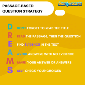 DREAMS is a great pneumonic to help students answer Dreamscape reading comprehension questions. This method encourages readers to review the title, passage and question before attempting to answer the questions. Additionally, it reminds readers that there can be more than one correct answer for each question (for “select all that apply” questions).