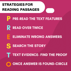 PRESTO encourages students to first scan the title, text, and question to gain a general sense of what is being asked, and then return to the text to read the passage carefully (sometimes twice). After reading, students should then eliminate choices that are clearly wrong, search the story to identify evidence to support the right answer, and, finally, bubble in the correct answer.