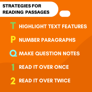 TPQ12 recommends paying close attention to all the individual aspects of the passage first (i.e. title, the numbering of lines, bolded/italicized words, etc.). After making note of these details, students should number the paragraphs and the lines. Finally, it directs the student to look at the question before fully taking the time to read the story over twice and coming to a conclusion on an answer.