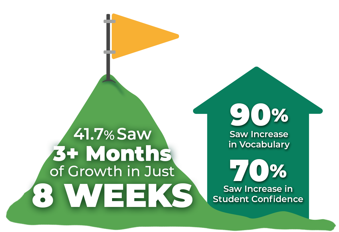 Using the platform is one thing, but it doesn’t matter if it doesn’t result in learner growth. Of the students who played with fidelity, 41.7% of them showed the equivalent of at least 3 months of literacy growth over the course of the eight-week pilot! The impacts were clear to their teachers, with over 70% stating they saw an increase or significant increase in student confidence, comprehension and fluency and over 90% of them seeing an increase or significant increase in student vocabulary and enjoyment!
